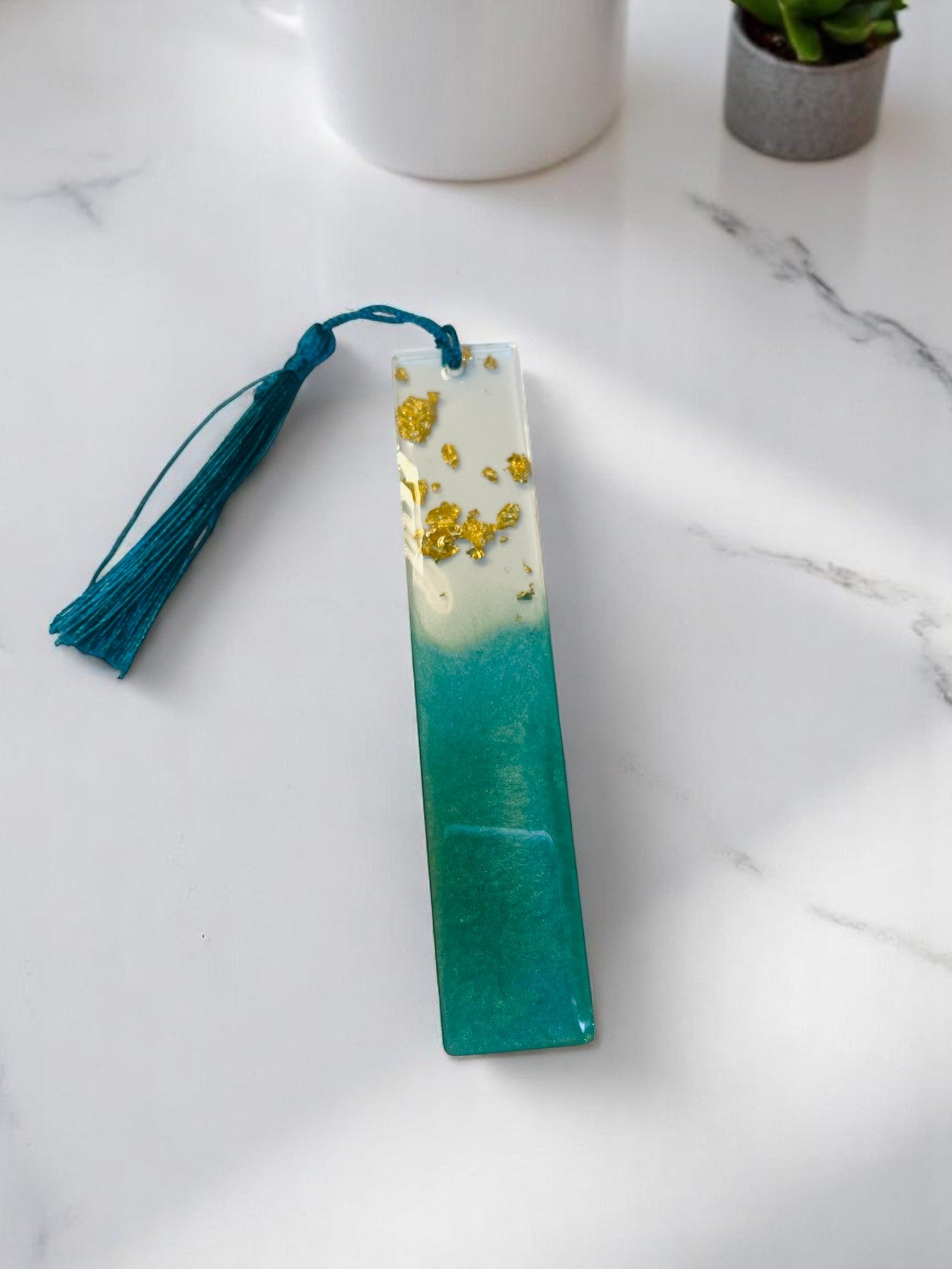 Ready to ship. A stunning mint resin bookmark with gold flakes, complete with a matching tassel.