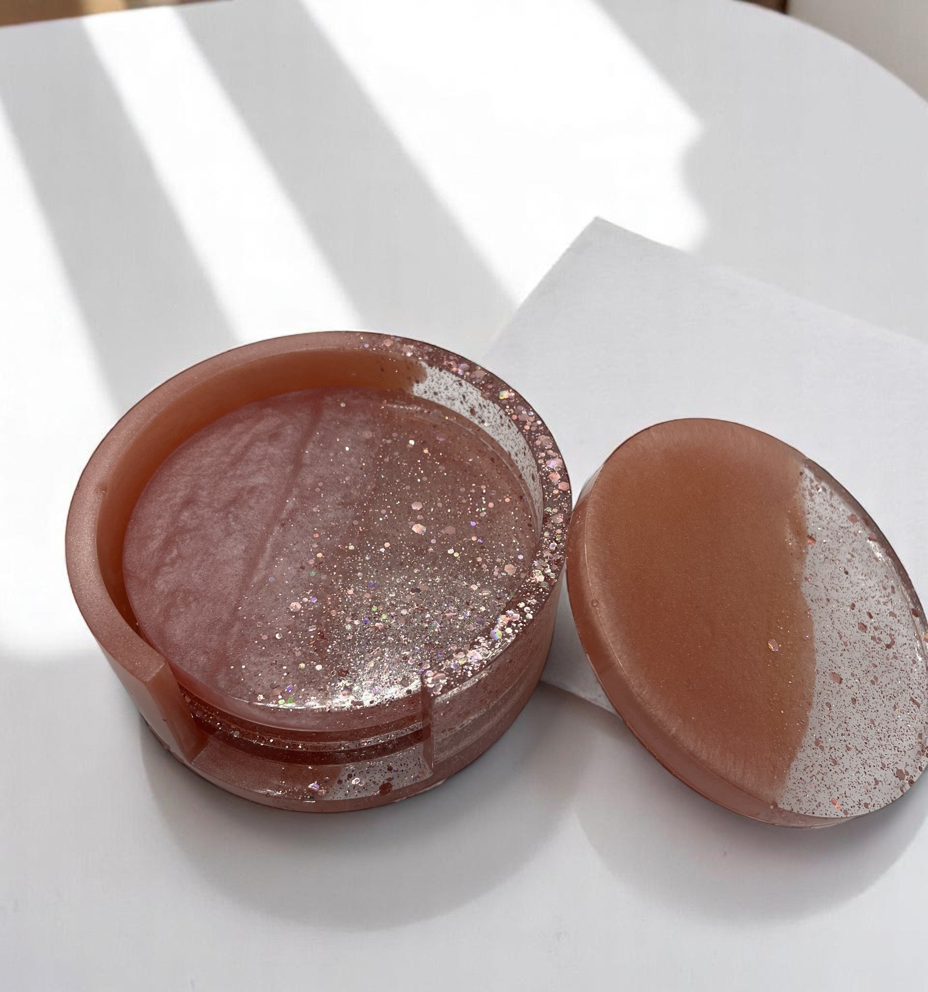 This coaster set is ready to ship. Misty Rose Pink with Pink glitter. This is a set of four coaster with a matching holder.